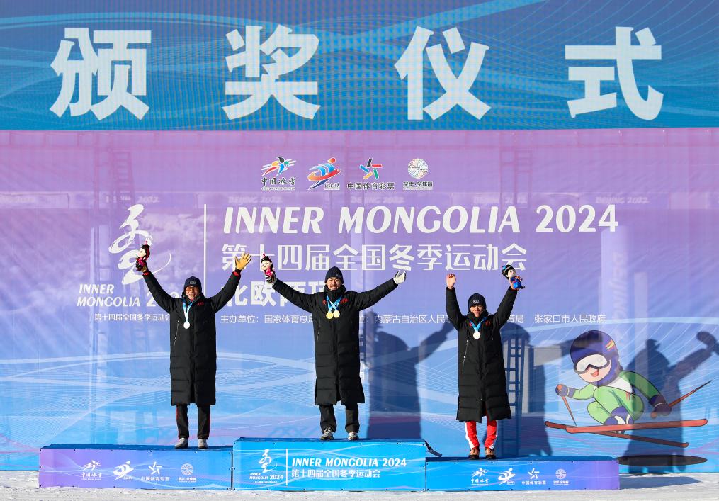 1月27日,冠軍趙嘉文(中)、亞軍范海斌(左)與季軍趙子賀在領(lǐng)獎臺上。新華社發(fā)(武殿森 攝)