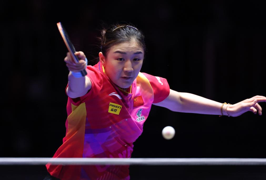 2月21日,中國(guó)隊(duì)球員陳夢(mèng)在第一盤(pán)比賽中回球。新華社記者 楊世堯 攝