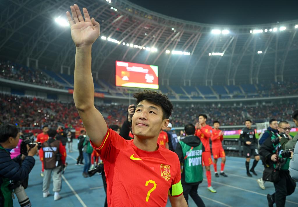 3月26日,武磊在2026年國際足聯(lián)世界杯亞洲區(qū)預選賽36強賽C組中國隊主場4:1戰(zhàn)勝新加坡隊的比賽后向觀眾致意。新華社記者 孫凡越 攝