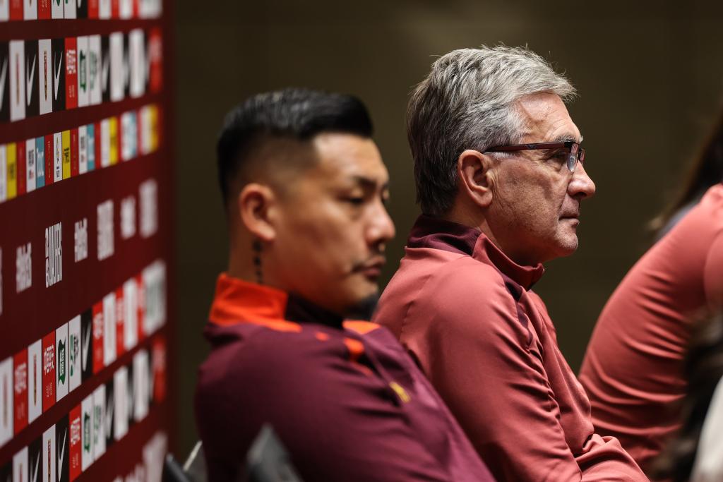 6月5日,中國隊主教練伊萬科維奇(右)和門將王大雷在賽前新聞發(fā)布會現(xiàn)場。新華社記者 潘昱龍 攝