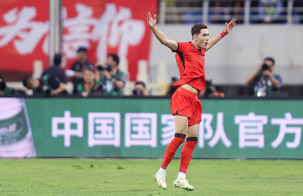 6月6日,首次代表國家隊(duì)出場的中國隊(duì)球員拜合拉木在進(jìn)球后慶祝。新華社記者 賈浩成 攝