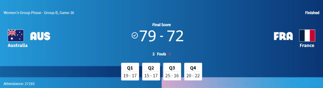 中新網(wǎng)北京8月5日電(記者 劉星晨)北京時(shí)間5日凌晨,巴黎奧運(yùn)會(huì)女籃小組賽全部結(jié)束。在最后一場(chǎng)比賽中,澳大利亞女籃79:72戰(zhàn)勝東道主法國(guó)女籃。本場(chǎng)取勝后,澳大利亞女籃以2勝1負(fù)的戰(zhàn)績(jī)出線。 由于中國(guó)女籃在所有小組第3中成績(jī)靠后,因此遺憾無緣八強(qiáng)。