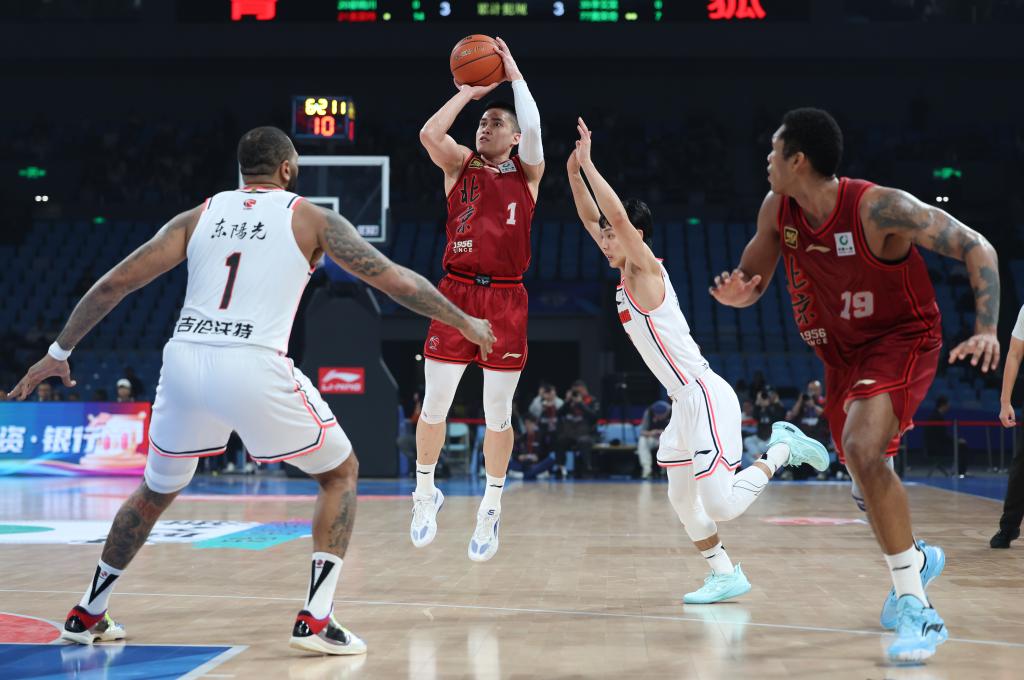 10月25日,北京隊(duì)球員陳盈駿(左二)在比賽中投籃。新華社記者 王楷焱 攝