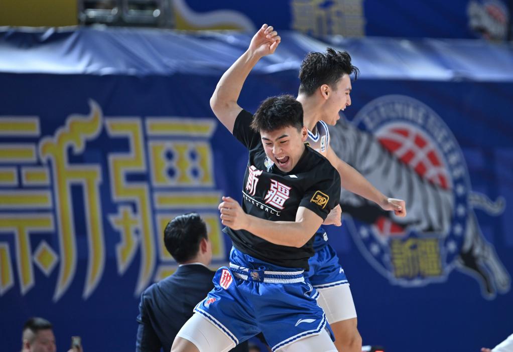 11月3日,新疆隊(duì)球員葛浩然(左)與隊(duì)友伊力福拉提在賽后慶祝。新華社記者 胡虎虎 攝