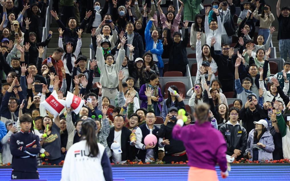 這是2024年9月30日,鄭欽文在2024中國(guó)網(wǎng)球公開(kāi)賽女單第三輪比賽后和觀眾互動(dòng)。新華社記者 白雪飛 攝