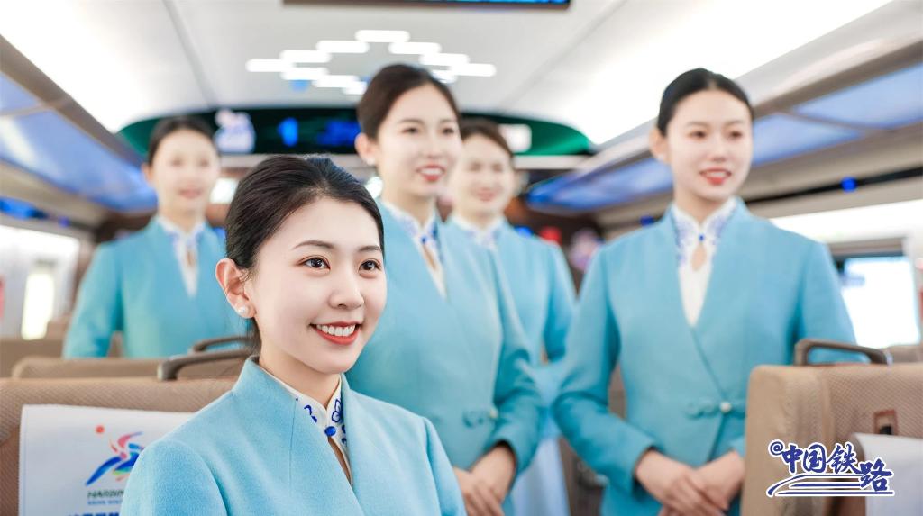 列車(chē)上,乘務(wù)員身著帶有雪花刺繡的藍(lán)白衣裙,熱情、得體地與乘客交流。車(chē)廂內(nèi)印有亞冬會(huì)元素的時(shí)刻表、貼紙隨處可見(jiàn),營(yíng)造出濃厚的冰雪體育盛會(huì)氛圍。