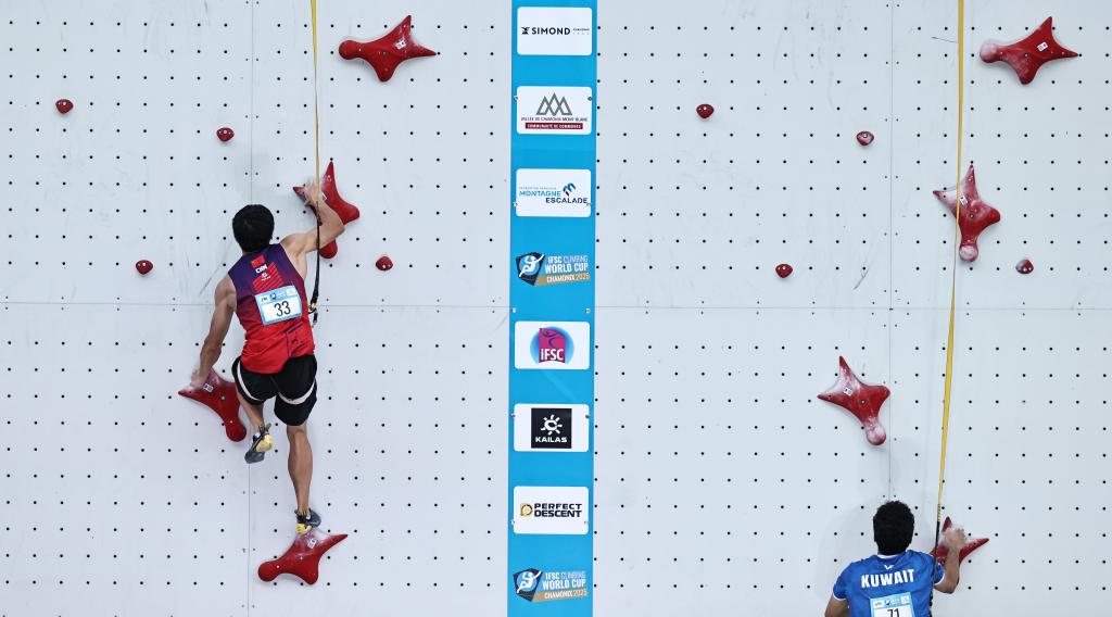 7月11日,中國(guó)選手龍見(jiàn)國(guó)(左)在2025攀巖世界杯霞慕尼站男子速度賽中。新華社記者 高靜 攝