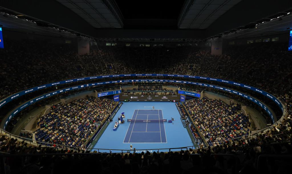 這是9月27日拍攝的鄭欽文對(duì)陣阿朗戈比賽現(xiàn)場(chǎng)。新華社記者 白雪飛 攝