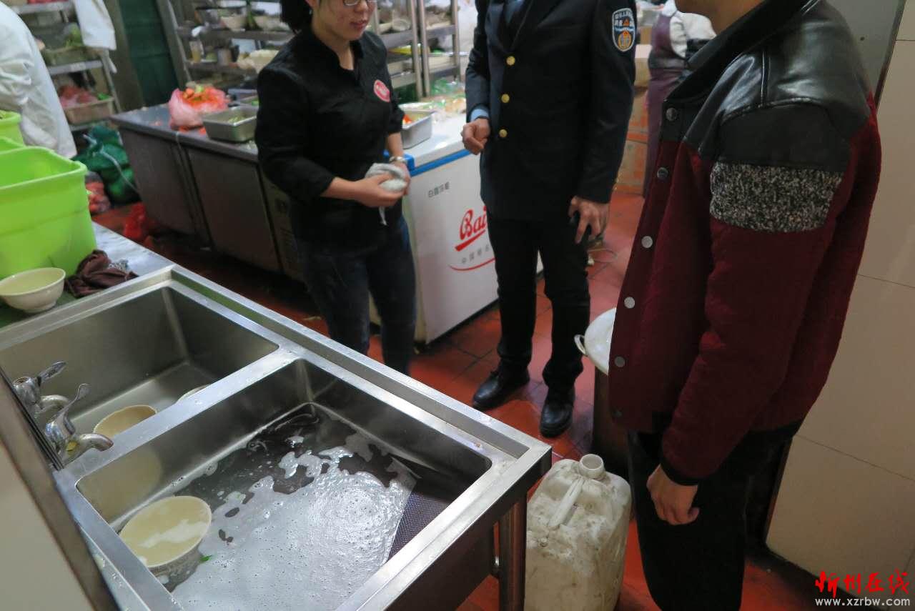 在兩家城門樓前的飯店中,執(zhí)法人員檢查了廚房的制餐環(huán)境,最后將目光鎖定在清洗碗盤所用的洗潔精上,發(fā)現(xiàn)這兩家飯店所用的洗潔精均無生產(chǎn)許可證明,產(chǎn)地則分別為太原和忻州。