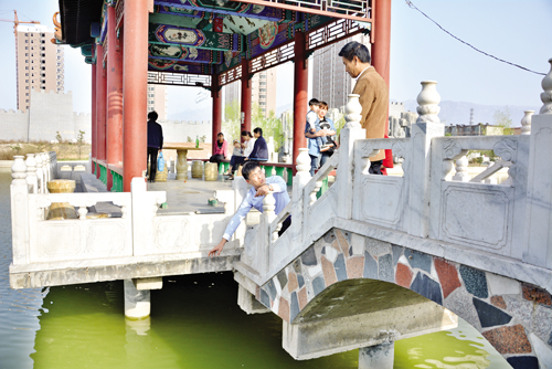 這個時候,宋利峰和女友劉丹,帶著姐姐的孩子也恰好走進水榭。孩子們在興趣方面往往會有驚人的趨同感,宋利峰的小外甥“眼饞”月月手里的魚食,在韓建萍的開導(dǎo)下月月從袋子里抓了一把魚食給了這個陌生的小伙伴。月月仍在水榭西側(cè)的欄桿處向水面撒食,宋利峰的小外甥在石拱橋上模仿月月的動作,兩個孩子之間的斜線距離不足一米。