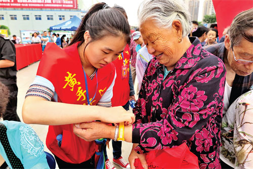 參與活動的愛心志愿者通過豐富多彩的文藝節(jié)目,宣傳黃手環(huán)的正確使用方法,還向廣大市民講解有關(guān)老年人的護理知識和一些急救常識,相關(guān)醫(yī)療機構(gòu)派出專業(yè)人員在現(xiàn)場開展了義診活動,市老齡辦對本次慈善公益活動給予了大力支持。圖為志愿者在為一位老人戴上黃手環(huán)。(魯明強 攝影報道)