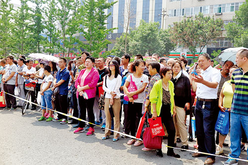 考場外,烈日炎炎,來自四面八方的考生家長們在樹蔭下、街道旁或靜靜地等候,或相互交流有關孩子們的話題,其緊張的心情,一點也不亞于考場內(nèi)正在考試的考生們??键c處,各愛心團體、商家搭亭設點,向考生和家長們免費贈送礦泉水、降暑飲料、學習資料,還有專車等待免費接送考生。也有不少教育培訓機構和學校組織人員向家長們發(fā)放資料,推介各自的教育特色和辦學水平。交警們堅守崗位,在烈日下疏導交通,各考點周邊交通環(huán)境秩序井然。