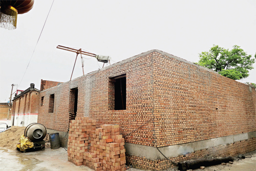 7月20日上午,記者驅(qū)車來到忻府區(qū)解原鄉(xiāng)北趙村。在一個緊鄰村委會北側(cè)的逼仄巷子里,記者見到了這棟已經(jīng)停工的紅磚房。一層和地下室主體已經(jīng)建成,修葺齊整的墻面與周圍的土階茅屋形成了鮮明的對比,沙子、攪拌機(jī)堆放在旁邊,讓本就不寬敞的巷子顯得更加擁擠不堪。