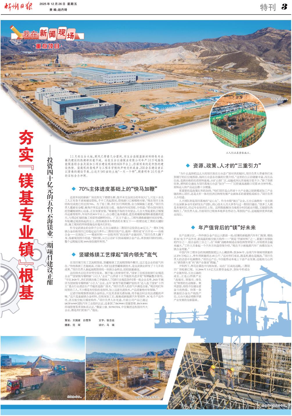 11月的五臺大地,寒風(fēng)已帶著幾分凜冽,而五臺縣鎂基新材料特色專業(yè)鎮(zhèn)內(nèi)建設(shè)的熱潮卻絲毫不減。站在五臺云海鎂業(yè)有限公司年產(chǎn)10萬噸高性能鎂基輕合金及深加工項(xiàng)目建設(shè)現(xiàn)場的828平臺上,撲面而來的是熾熱的建設(shè)熱情。裝載機(jī)的轟鳴聲與工程車穿梭的聲響交織成曲,200余名建設(shè)者正以緊湊的建設(shè)節(jié)奏,讓這片545畝的土地“一天一個(gè)樣”,朝著明年10月投產(chǎn)的目標(biāo)全力沖刺。 ◆70%主體進(jìn)度基礎(chǔ)上的“快馬加鞭” 還原車間的嶄新廠房在陽光下熠熠生輝,推開未完全閉合的車間大門,只見十余名工人正有條不紊地鋪設(shè)管線,手中工具起落間,管線接口已被精準(zhǔn)對接?!艾F(xiàn)在項(xiàng)目主體結(jié)構(gòu)完成度已經(jīng)達(dá)到70%。為了搶工期,我們實(shí)行兩班倒,全力保障施工進(jìn)度?!表?xiàng)目負(fù)責(zé)人戴著安全帽,額角汗珠見證著攻堅(jiān)力度。他指向車間頂部,介紹道:“那臺國內(nèi)領(lǐng)先的豎罐煉鎂核心設(shè)備,正在加緊安裝?!表樦种傅姆较蛲?,幾臺大型起重機(jī)正緩緩吊運(yùn)著零部件,車間外的819平臺上,辦公樓已基本建成,藍(lán)色玻璃幕墻倒映著澄澈的藍(lán)天,與周邊忙碌的施工場景形成鮮明對比。廠區(qū)主干道上,工程車滿載著建材來回穿梭,車輪碾過地面揚(yáng)起的塵土,很快被灑水車噴灑的水霧壓下——即便在趕工期的關(guān)鍵階段,施工現(xiàn)場的環(huán)保措施也絲毫未打折扣。 作為寶武鎂業(yè)的全資子公司,五臺云海鎂業(yè)二期項(xiàng)目總投資達(dá)40億元?!耙黄?萬噸鎂合金冶煉項(xiàng)目已經(jīng)穩(wěn)定運(yùn)行多年;二期項(xiàng)目投產(chǎn)后,能和一期形成‘礦石開采——冶煉合金——壓鑄加工——精密材料——回收利用’的全鎂產(chǎn)業(yè)鏈閉環(huán)?!表?xiàng)目負(fù)責(zé)人蹲下身,指著規(guī)劃圖介紹道,“到時(shí)候,從白云巖礦石到高端鎂合金產(chǎn)品,再到廢舊鎂材回收,整個(gè)過程能實(shí)現(xiàn)100%綠色循環(huán)利用?!?/p> ◆豎罐煉鎂工藝撐起“國內(nèi)領(lǐng)先”底氣 在項(xiàng)目展廳的工藝流程圖前,豎罐煉鎂工藝流程圖格外醒目,這正是企業(yè)的底氣所在?!皞鹘y(tǒng)煉鎂工藝能耗高、污染大,咱們這套豎罐煉鎂技術(shù),是寶武鎂業(yè)研發(fā)了十幾年的成果?!表?xiàng)目負(fù)責(zé)人拿起流程圖旁的一塊鎂合金樣品,輕輕掂量著說。 這份技術(shù)自信并非憑空而來。展廳墻上的榮譽(yù)欄里,“國家工信部首批鎂行業(yè)規(guī)范企業(yè)”“國家級專精特新‘小巨人’企業(yè)”“山西省十大節(jié)能技術(shù)進(jìn)步獎(jiǎng)”等牌匾整齊排列?!霸缭?020年,我們的鎂冶煉工序就納入了《鎂行業(yè)規(guī)范條件》第一批企業(yè)名單,2021年被評為國家級專精特新‘小巨人’企業(yè),去年‘新型節(jié)能豎罐爐窯技術(shù)’還入選了國家‘十四五’重點(diǎn)行業(yè)清潔生產(chǎn)節(jié)能改造推廣技術(shù)?!表?xiàng)目負(fù)責(zé)人的語氣中滿是自豪,“現(xiàn)在咱們車間里的工人,不少都是有經(jīng)驗(yàn)的老技師,加上這套先進(jìn)技術(shù),產(chǎn)品質(zhì)量絕對有保障?!?/p> 記者仔細(xì)觀察那塊鎂合金樣品,只見其表面光滑如鏡,用手敲擊時(shí)會(huì)發(fā)出清脆的聲響?!斑@只是基礎(chǔ)鎂合金材料,后續(xù)深加工后,能做成新能源汽車零部件、3C電子產(chǎn)品外殼,甚至航空航天精密構(gòu)件?!表?xiàng)目負(fù)責(zé)人補(bǔ)充道,目前公司產(chǎn)品已通過IATF16949國際汽車工業(yè)組織認(rèn)證,還拿到了ISO9001質(zhì)量管理、ISO14001環(huán)境管理等多項(xiàng)體系認(rèn)證?!跋窀皇靠?、TOYOTA、中信集團(tuán)這些國內(nèi)外大企業(yè),都是我們的客戶?!彼f。 ◆資源、政策、人才的“三重引力” “為什么選擇把這么大的項(xiàng)目放在五臺縣?”面對我的疑問,項(xiàng)目負(fù)責(zé)人帶著我們來到展廳的區(qū)位地圖前,指向五臺縣東冶鎮(zhèn)的位置介紹,“這里的白云巖儲(chǔ)量豐富,而且品位高,是鎂冶煉的優(yōu)質(zhì)原料基地,從礦山到廠區(qū),運(yùn)輸成本比其他地方低不少?!背速Y源優(yōu)勢,便利的交通也為項(xiàng)目落地五臺縣“加分”——廠區(qū)距離高速路口僅需15分鐘車程,原料運(yùn)入和產(chǎn)品運(yùn)出都十分便捷。 更重要的是政策紅利的加持?!霸蹅冺?xiàng)目是山西省十大產(chǎn)業(yè)鏈之鋁鎂精深加工產(chǎn)業(yè)鏈的核心項(xiàng)目,還是太忻一體化經(jīng)濟(jì)區(qū)轉(zhuǎn)型發(fā)展產(chǎn)業(yè)新體系的重要組成部分?!表?xiàng)目負(fù)責(zé)人介紹道。 人才團(tuán)隊(duì)則是項(xiàng)目落地的“定心丸”。作為市級“鏈主”企業(yè),五臺云海擁有一支在鎂行業(yè)深耕20余年的研發(fā)生產(chǎn)團(tuán)隊(duì),核心技術(shù)人員大多參與過一期項(xiàng)目建設(shè)?!昂芏喙と硕际潜镜卮迕?,經(jīng)過專業(yè)培訓(xùn)后上崗。這樣既能解決當(dāng)?shù)夭糠执迕窬蜆I(yè)問題,又能留住熟練技工?!痹撠?fù)責(zé)人說,目前項(xiàng)目已吸納本地多名勞動(dòng)力,等到投產(chǎn)后,還能提供更多的就業(yè)崗位。 ◆年產(chǎn)值背后的“鎂”好未來 在產(chǎn)品展示區(qū),一件件鎂合金產(chǎn)品讓人眼前一