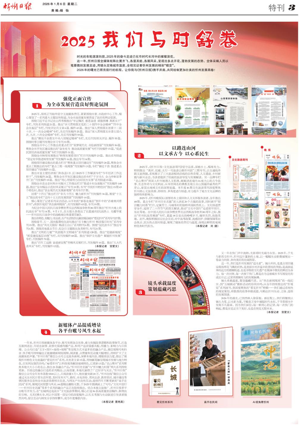 2025年,《忻州晚報》以濃厚的本土情懷和人文關(guān)懷服務(wù)讀者,全年推出48期。重點專欄“忻州歷史名鎮(zhèn)”深入講述20個古鎮(zhèn)的故事,同時新開“探訪魅力村落”欄目,定襄芳蘭、馬城等村的獨特風(fēng)情躍然紙上。文化報道貫穿全年,延續(xù)了二十四節(jié)氣的圖文解讀,推動“文化中國行”走進原平同川、東社等地。在中國人民抗日戰(zhàn)爭暨世界反法西斯戰(zhàn)爭勝利80周年之際,推出“忻州抗戰(zhàn)英模譜”專欄,重溫18位老兵的崢嶸歲月,緬懷先烈,致敬英雄。此外,晚報積極回應(yīng)社會關(guān)切,對中高考政策、流感防護、供暖保障等社會焦點、民生熱點及時報道,展現(xiàn)了媒體的責(zé)任與溫度,體現(xiàn)出鮮明的地域特色和時代擔(dān)當(dāng)。(本報記者劉捷)