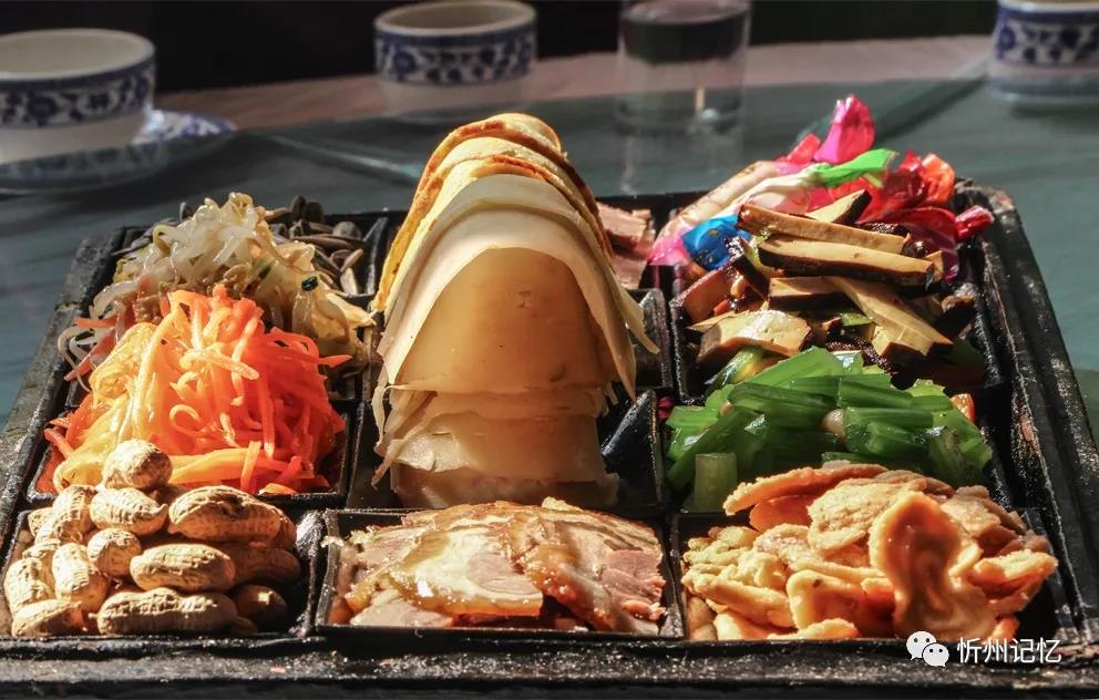 水菜盒子,是一個(gè)木制的長(zhǎng)方形盒子,長(zhǎng)約40多厘米,寬約20多厘米,高約10多厘米。木盒分蓋子和底座,底色多漆為紅黑兩色。蓋子上有的還畫有人物、山水、花卉等圖案,為描金漆處理。底座內(nèi)有12個(gè)木制的小長(zhǎng)方形碟子,以3行4列的形式排列,用來裝涼拌菜。傳統(tǒng)的涼拌菜為四葷、二素、六干果,但后來大多演變?yōu)樗娜?、四素、四干果。其中的“四葷”為雞蛋餅、冷片肉、蒸肉、鹵肉;“四素”幾乎全是清淡的蔬菜,如綠豆芽、胡蘿卜、土豆絲、菠菜、胡芹等;“六干果”分別是葵花子、水果糖、南瓜子、油蛋蛋、金銀棗、蝦片。在忻府區(qū),過去家家戶戶但凡婚喪嫁娶,總要上水菜盒子,這就是老忻州人好說的“八八六六”。其中“八八”即水菜盒子(除去里面的干果正好8小碟菜),代表涼菜。