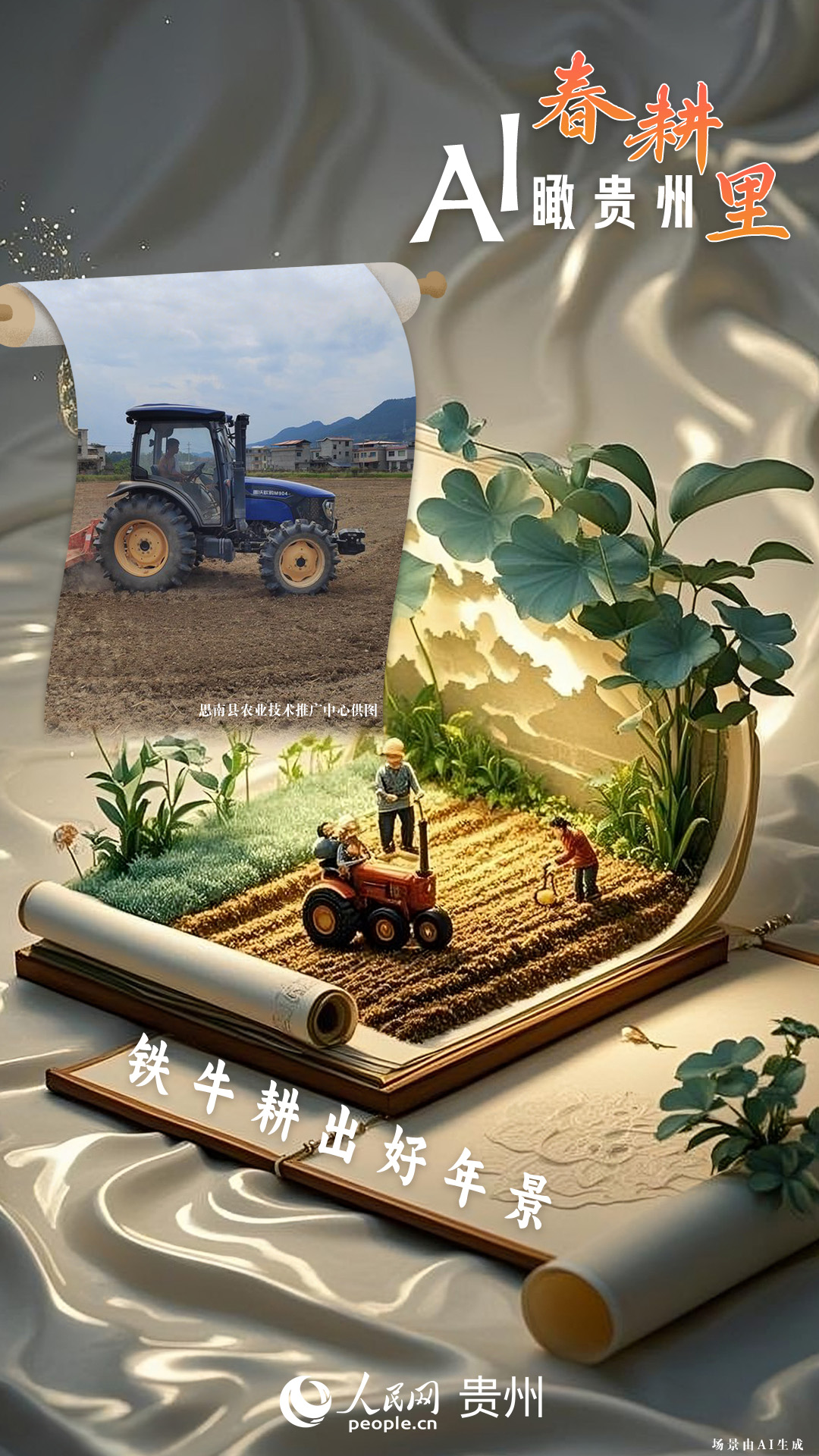春回大地,萬物復(fù)蘇,黔地山川間正上演著一場(chǎng)生機(jī)勃勃的春耕盛景。傳統(tǒng)農(nóng)耕與現(xiàn)代科技在這里交織,描繪出一幅幅充滿希望的畫卷。 春耕不僅是農(nóng)時(shí)的序曲,更是科技與土地對(duì)話的現(xiàn)場(chǎng)。在貴州這片喀斯特地貌與民族文化交織的土地上,春耕正經(jīng)歷一場(chǎng)靜默的變革:無人機(jī)掠過千年梯田,算法解析紅壤墑情,覆膜機(jī)織就“智能外衣”,而彎腰勞作的農(nóng)人,依然用繭手傳遞著古老農(nóng)耕文明的溫度。 本期跟隨AI一起描繪貴州春耕里的故事。