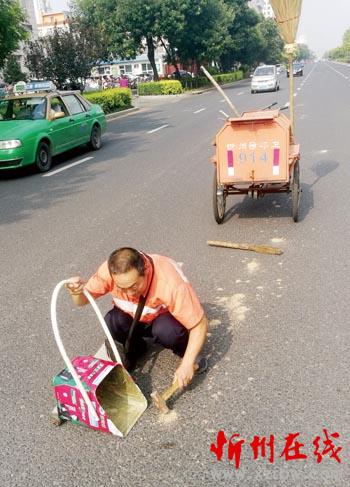 7月22日中午,忻州城區(qū)和平街,烈日當頭,車水馬龍。這時記者看到在忻州師范學院路段,一位環(huán)衛(wèi)工人手執(zhí)小鐵錘,一絲不茍蹲在馬路上敲打撒落在路面上的粘泥,然后再用掃帚認真清理干凈。這種敬業(yè)精神,值得大家學習。(赫在榮 攝)