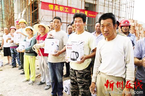 圖為靜樂縣工會為該縣殘疾人康復(fù)和托養(yǎng)中心工程施工現(xiàn)場工人發(fā)放熱水壺。