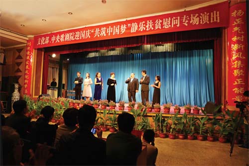 日前,文化部、中央歌劇院在靜樂縣舉辦了迎國慶“共筑中國夢”扶貧慰問專場演出。中央歌劇院的藝術家與當?shù)馗刹咳罕娡_獻藝,共同重溫紅色經(jīng)典,熱情謳歌黨的光輝業(yè)績。整場演出薈萃眾多藝術名家,演員們激情演唱了《我們走在大路上》《我為祖國獻石油》《打起手鼓唱起歌》《草原上升起不落的太陽》等膾炙人口的經(jīng)典老歌,引起了觀眾強烈的共鳴,現(xiàn)場掌聲、歡呼聲、叫好聲連綿不斷。演出不僅給當?shù)厝罕妿硪粓鼍始姵实奈幕⒀?,也激勵了干群齊心協(xié)力打好脫貧攻堅戰(zhàn)的斗志,增強了百姓實現(xiàn)全面脫貧、全面小康的信心和決心。(小敏 攝)