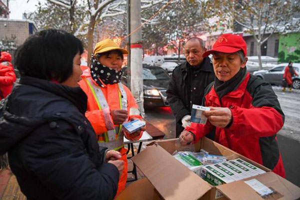 圖說(shuō):蔣愛榮(右一)為環(huán)衛(wèi)工人分發(fā)愛心人士捐贈(zèng)的感冒藥(11月23日攝)。圖片來(lái)源:新華社