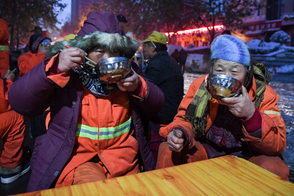 圖說(shuō):在鄭州市廣電南路愛心粥屋,環(huán)衛(wèi)工人們?cè)趷坌闹辔莩栽顼垼?1月23日攝)。圖片來(lái)源:新華社
