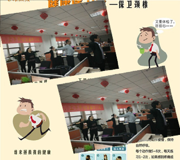 開門紅戰(zhàn)役打響,全員全身心投入,同時對職場內(nèi)員工的身體健康尤其是頸椎健康更是極大挑戰(zhàn)。中支綜管部門及時提醒辦公室內(nèi)的上班族,應(yīng)該保護(hù)頸椎健康,提示半小時后應(yīng)該起身活動一下,用頭寫“米”字,并適時組織員工停下手中的工作,打開電視機(jī),集中做好工間勁椎操。保護(hù)頸椎,保護(hù)自己,服務(wù)公司,以充沛的體能服務(wù)開門紅戰(zhàn)役。