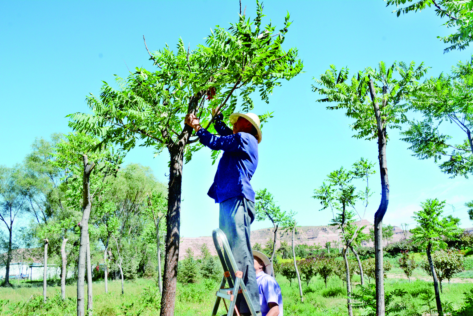 7月21日,河曲縣濱河生態(tài)濕地公園,園林工正在鋸掉火炬樹枯干枯枝,提升整體美觀度。該縣在高標準規(guī)劃、高質量施工基礎上,強化綠植各項管護措施,硬是將一片“爛河灘”打造成450畝生態(tài)濕地公園,有效改善了縣城生態(tài)環(huán)境。