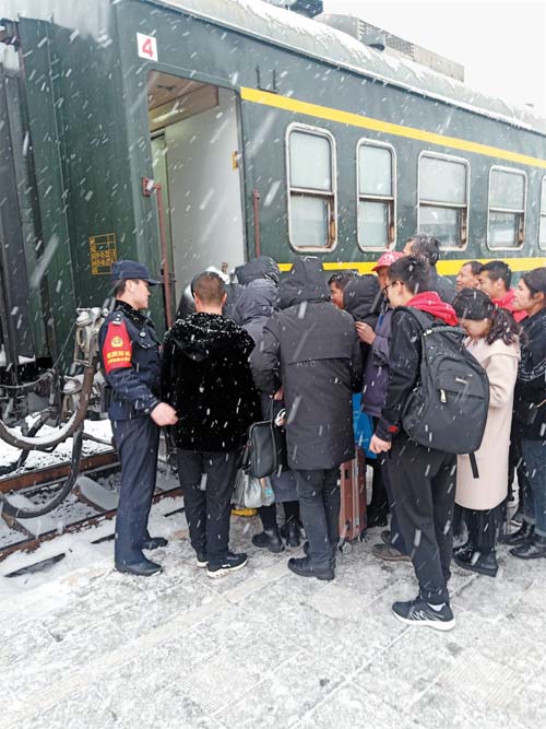 1月5日,五寨縣普降大雪。五寨火車站派出所民警冒雪維護(hù)秩序,指揮疏導(dǎo)交通,確保旅客在客流高峰期安全乘車。(索效剛 攝)