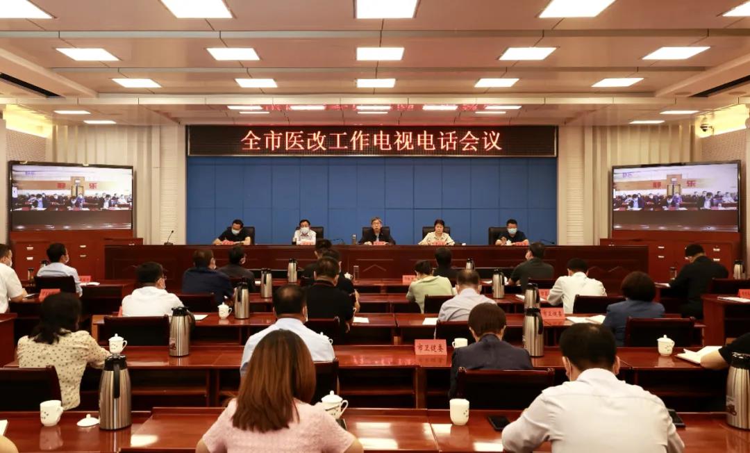 全市醫(yī)改工作視頻會議會場。張存良 攝 本報訊 (記者任逢春)9月9日,全市醫(yī)改工作視頻會議召開,深入學習貫徹習近平總書記關于深化醫(yī)藥衛(wèi)生體制改革的重要指示精神,認真落實2021年全國、全省醫(yī)改工作會議精神,總結(jié)交流典型經(jīng)驗,安排部署下一階段重點工作任務。市委副書記、市長、市醫(yī)改領導小組組長朱曉東出席會議并講話。副市長、市醫(yī)改領導小組副組長賈玲香主持會議。市政府秘書長張艮生出席會議。