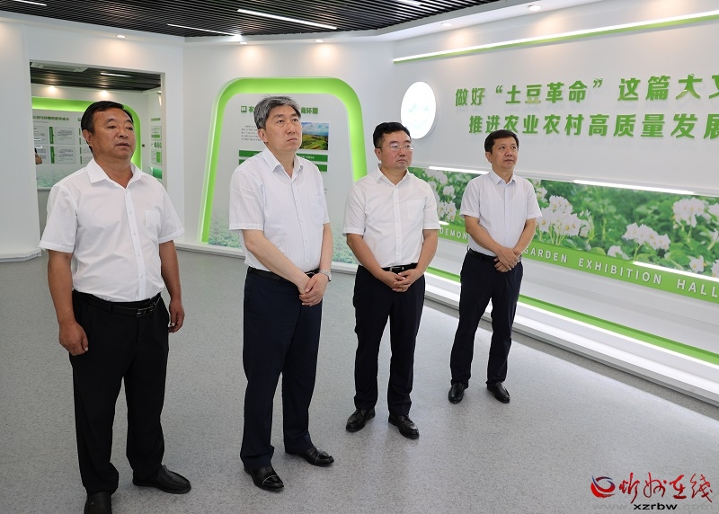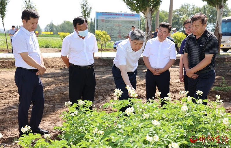 五寨是傳統(tǒng)農(nóng)業(yè)大縣,馬鈴薯種植歷史悠久。如今在小胡會(huì)村的馬鈴薯新品種、新技術(shù)示范基地,綠油油的馬鈴薯,白色小花競(jìng)相開(kāi)放,抬頭遠(yuǎn)眺,跨過(guò)大型移動(dòng)噴灌設(shè)備,馬鈴薯苗一眼望不到邊。基地通過(guò)馬鈴薯新品種、新技術(shù)的示范,篩選出品質(zhì)優(yōu)、抗病性強(qiáng)、產(chǎn)量高、適宜本土種植的馬鈴薯新品種(系),推動(dòng)馬鈴薯先進(jìn)適用栽培新技術(shù)的推廣應(yīng)用。朱曉東走進(jìn)田壟,察看薯苗長(zhǎng)勢(shì),與農(nóng)技專業(yè)人員交流,了解減化肥減農(nóng)藥試驗(yàn)情況,詢問(wèn)菜用型馬鈴薯與加工型馬鈴薯的價(jià)值區(qū)別。他強(qiáng)調(diào),要切實(shí)把五寨80里丁字平川耕地資源用足用好,深研細(xì)究新品種新技術(shù),不僅要在馬鈴薯的塊莖上做文章,在莖、葉、花上都要深入研究,調(diào)動(dòng)專業(yè)機(jī)構(gòu)專業(yè)人員在馬鈴薯花入茶、提取香精等更多方面努力探索,切實(shí)放大規(guī)模產(chǎn)業(yè)的獨(dú)特優(yōu)勢(shì)。