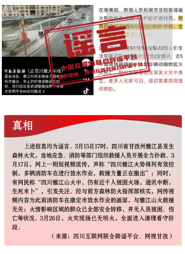 為博流量炮制安全類謠言,引發(fā)恐慌。春季歷來是森林火災(zāi)高發(fā)時段。加之開春后,工廠企業(yè)復(fù)產(chǎn)復(fù)工,致災(zāi)因素明顯增多。3月,全國多地發(fā)生火災(zāi)事故,一些網(wǎng)民為蹭熱點、博流量,趁機編織謠言,引發(fā)公眾恐慌。3月中旬,四川省甘孜州雅江縣發(fā)生森林火災(zāi),在當?shù)貞?yīng)急、消防等部門組織救援人員全力撲救之際,卻有人編造“四川雅江山火救援力量正在撤出”“雅江仍有近千人被困火場”“雅江山火有三名撲火人員犧牲”等失實信息,嚴重干擾災(zāi)害應(yīng)急響應(yīng)和救援工作?!爸貞c南坪商業(yè)大樓火災(zāi)傷亡慘重”“湖南省長沙市天心區(qū)發(fā)生重大刑案,警方發(fā)布懸賞通告”“天津一銀行發(fā)生搶劫”等嚴重失實的涉公共安全類視頻流傳網(wǎng)絡(luò),或是造謠者自編自導(dǎo),或是利用AI技術(shù)偽造,卻引發(fā)群眾恐慌、造成惡劣影響。此外,“綠得發(fā)黑的菠菜不能吃”“清明蔗、毒過蛇”等食品安全類謠言,則是利用了時令和人們對食物中毒的擔憂情緒,夸大其詞、危言聳聽,目的都是販賣焦慮、制造恐慌,進而吸引眼球、騙取流量。