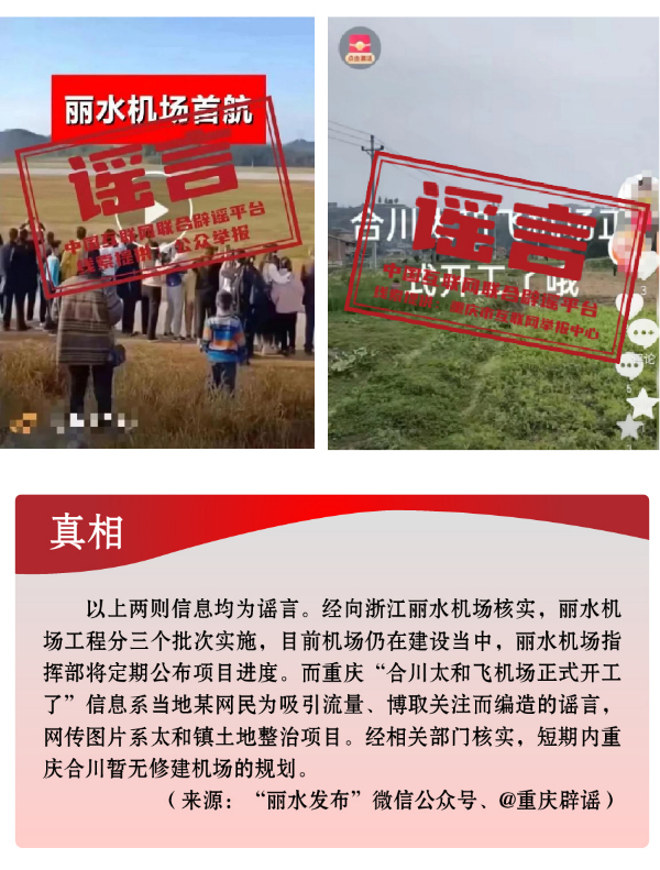 搭蹭熱點散播民生類謠言,渲染焦慮。3月,全國兩會召開,“民生清單”熱度高。“春招”“春游”等時間節(jié)點,有關(guān)招工就業(yè)、疫病傳染等內(nèi)容也成為個別網(wǎng)民博眼球的素材。一些個人或自媒體歪曲甚或虛構(gòu)事實,編造散布社會民生謠言,引發(fā)公眾不必要的焦慮。如,別有用心者惡意虛構(gòu)事實,發(fā)布“重慶80%的工廠暫停招聘”“湖南郴州疫情卷土重來”等虛假信息,渲染負面情緒、徒增公眾憂慮、擾亂社會秩序;還有人為吸引流量、博取關(guān)注,根據(jù)主觀臆想,采取移花接木等手段,散播“京滬高速公路停止收費”“浙江麗水機場已建成投用并首航”“重慶合川太和飛機場正式開建”等涉重大基礎(chǔ)設(shè)施建設(shè)項目的假消息,誤導(dǎo)公眾認知,擾亂群眾交通出行秩序。