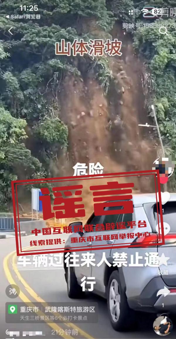 真相:近日,有網(wǎng)民發(fā)布了一則“山體滑坡危險(xiǎn),過往車輛行人禁止通行”的視頻,視頻定位標(biāo)注為“重慶市武隆喀斯特旅游區(qū)”。經(jīng)重慶市武隆區(qū)多部門核實(shí),該區(qū)近期未發(fā)生大面積山體滑坡事件。網(wǎng)傳視頻實(shí)為2024年6月3日臺(tái)灣省基隆市中正區(qū)潮境公園入口發(fā)生的大規(guī)模山體滑坡事件,而視頻中所標(biāo)注的定位信息系網(wǎng)民發(fā)布視頻的地點(diǎn),而非事件發(fā)生的地點(diǎn)。(來源:“重慶辟謠”微信公眾號、網(wǎng)信武隆