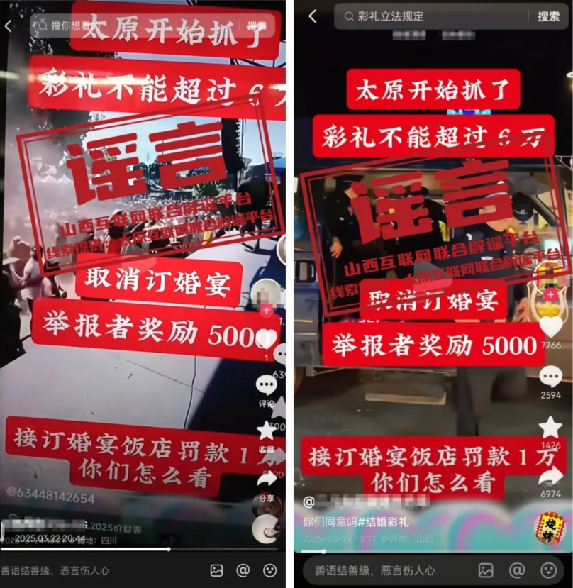 近日,網(wǎng)絡上流傳“太原彩禮限6萬,違規(guī)者將被罰款甚至拘留”的消息,引發(fā)關注。經(jīng)屬地相關部門調查核實,以上為不實信息,并無任何官方文件或政策依據(jù)。太原互聯(lián)網(wǎng)聯(lián)合辟謠平臺已發(fā)布相關辟謠信息,望廣大網(wǎng)民不聽、不信、不傳。