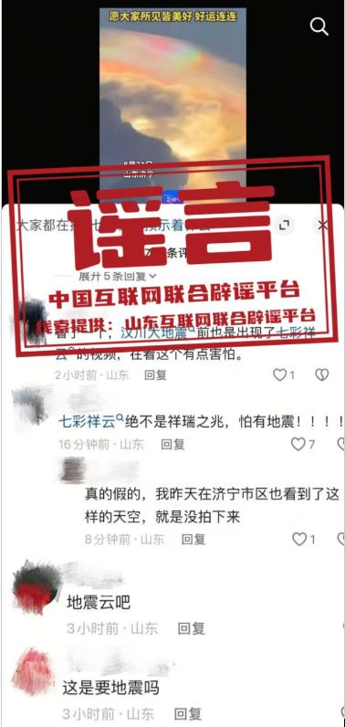 真相:近日,山東濟(jì)寧多地市民觀察到天空中出現(xiàn)大片色彩斑斕、形態(tài)似羽毛或波浪的云層,許多人稱之為“祥云”,有部分網(wǎng)民將它與“地震預(yù)測(cè)”的民間說法相關(guān)聯(lián),稱是“地震云”“不是祥瑞之兆,是要地震”。