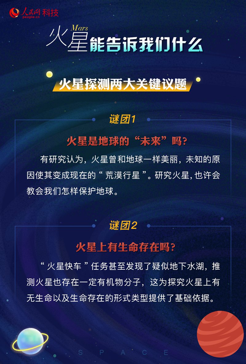 是什么原因導致火星失去了水?它怎樣從一個藍色星球變成現(xiàn)在一片荒漠的紅色星球?其大氣、環(huán)境是如何演化的?火星的今天有沒有可能就是地球的明天?這些都是科學家們想要通過相關探測去解答的問題。
