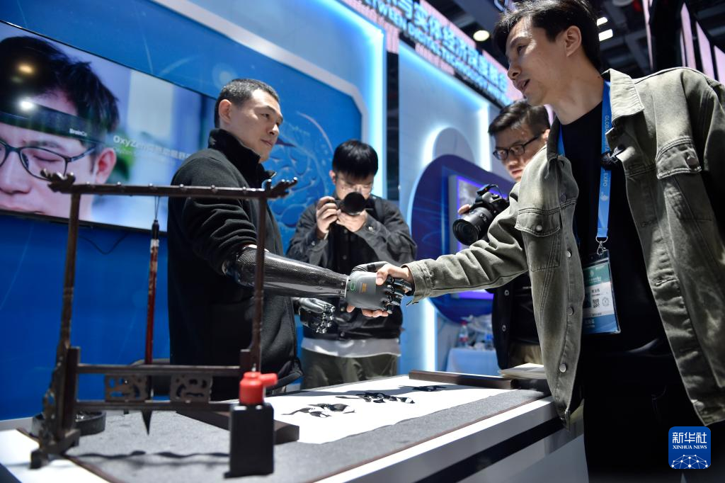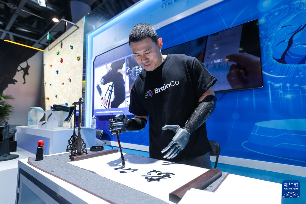 在展位現(xiàn)場(chǎng),另一名上肢截肢的人士在使用強(qiáng)腦科技推出的智能仿生手。這也是基于非侵入式腦機(jī)接口技術(shù)的產(chǎn)品。使用者利用智能仿生手不但可輕松取物,還能寫(xiě)毛筆字。
