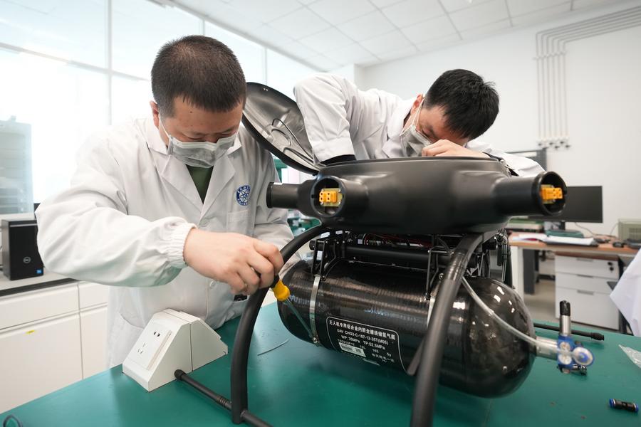 3月28日,科研人員在為無(wú)人機(jī)裝配高比能氫混動(dòng)力電源。新華社記者 潘昱龍 攝