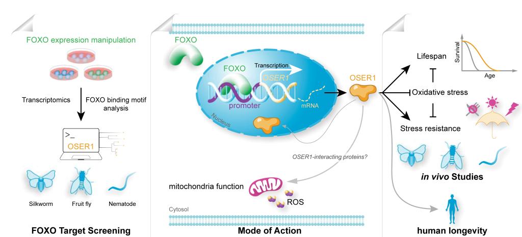 記者從西南大學獲悉,該校資源昆蟲高效養(yǎng)殖與利用全國重點實驗室教授代方銀團隊聯(lián)合國外專家研究發(fā)現(xiàn)調(diào)控壽命的新基因OSER1,并在家蠶、線蟲、果蠅等多物種中研究揭示了其作用機制。作為長壽基因FOXO(叉頭框蛋白O)的靶基因,OSER1對壽命的影響得到人類受試者研究結果支持。