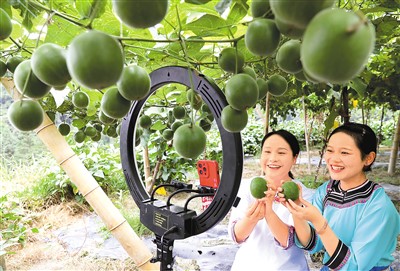 互聯(lián)網(wǎng)平臺(tái)互聯(lián)互通,將為電子商務(wù)從業(yè)者和消費(fèi)者帶來更多便利。圖為日前,在貴州省黔東南苗族侗族自治州榕江縣仁里水族鄉(xiāng)通倒村羅漢果種植基地,工作人員在直播推介當(dāng)?shù)爻霎a(chǎn)的羅漢果。李長華攝(人民視覺)
