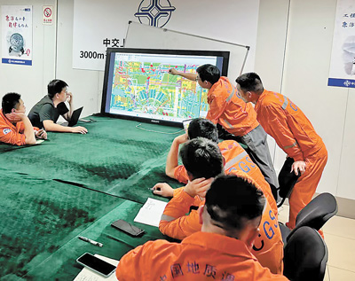 “夢想”號指揮部主要負責人周昶(前)在動力控制室查看船上情況。 中國地質調查局宣傳教育中心供圖