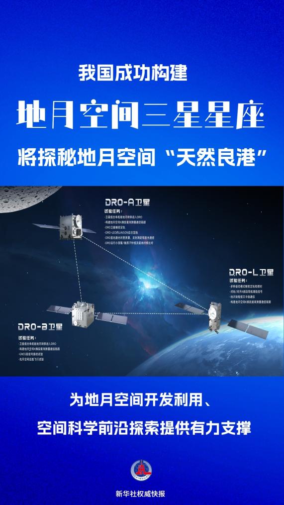 記者從中國(guó)科學(xué)院空間應(yīng)用工程與技術(shù)中心獲悉,我國(guó)已成功構(gòu)建由三顆衛(wèi)星組成的地月空間三星星座,將聚焦地月空間遠(yuǎn)距離逆行軌道(DRO)開(kāi)展深入科學(xué)研究。