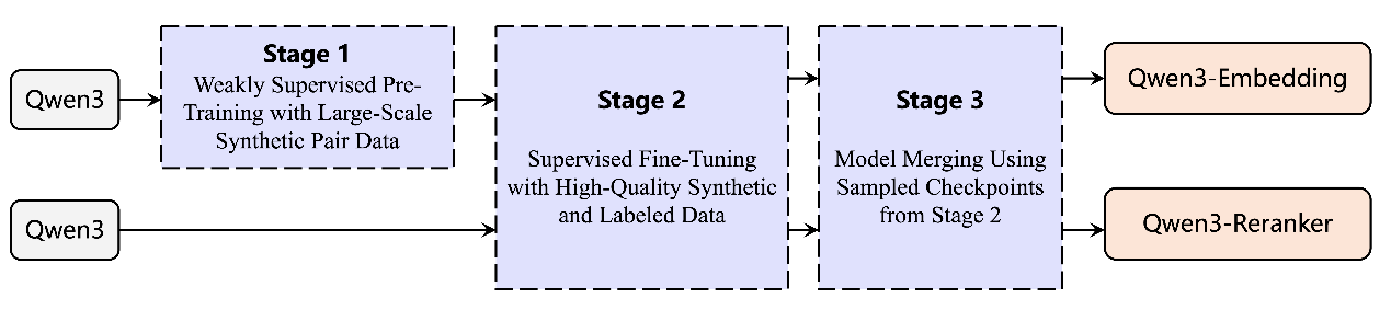 向量模型像是AI的“翻譯器”,它可以將文本、圖片等人類可認(rèn)知的非結(jié)構(gòu)化信息,映射到機(jī)器更易理解的向量空間,再基于這些向量實(shí)現(xiàn)高效的信息分類、檢索或排序。也正因此,向量模型對(duì)于提升AI的語義理解、信息檢索、多模態(tài)融合等核心能力至關(guān)重要?;谇?模型,通義團(tuán)隊(duì)通過對(duì)比訓(xùn)練、SFT、模型融合等方法,打造出全新的千問3向量模型,包含文本嵌入模型 Qwen3-Embedding以及文本排序模型Qwen3-Reranker。