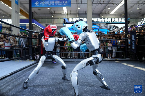 在2025世界機(jī)器人大會(huì)展館內(nèi),觀眾在宇樹機(jī)器人展臺(tái)觀看機(jī)器人拳擊展示(8月11日攝)。新華社記者 鞠煥宗 攝