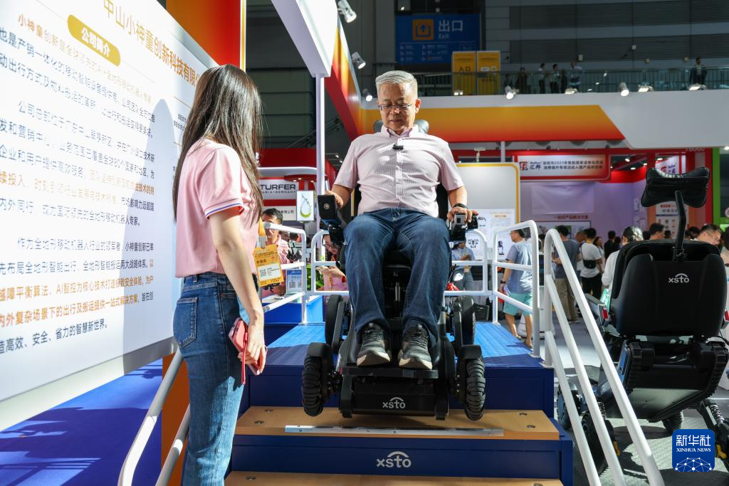 9月12日,觀(guān)眾在國(guó)際智慧養(yǎng)老產(chǎn)業(yè)博覽會(huì)現(xiàn)場(chǎng)體驗(yàn)智能出行機(jī)器人。新華社記者 梁旭 攝