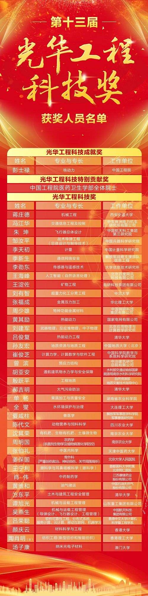 此外,還有機(jī)械工程專家蔣莊德、計(jì)量專家李天初、人工智能專家王海峰、特種功能金屬材料專家周少雄等不同學(xué)科領(lǐng)域的39位專家獲得光華工程科技獎(jiǎng),這些專家均以非凡的積極性和創(chuàng)造性,在各自領(lǐng)域取得了傲人成績,為我國工程科學(xué)技術(shù)事業(yè)的發(fā)展做出了巨大貢獻(xiàn)。