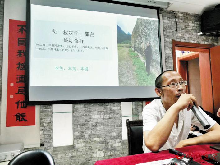 本報(bào)訊 8月15日晚,位于忻州市七一北路的好目匠眼鏡店迎來(lái)一場(chǎng)文學(xué)盛會(huì)。保德縣、岢嵐縣、五寨縣、原平市、定襄縣的詩(shī)歌愛(ài)好者,與忻州城區(qū)的詩(shī)歌愛(ài)好者一起聆聽(tīng)了著名詩(shī)人張二棍關(guān)于詩(shī)歌創(chuàng)作的講座,甚至有詩(shī)歌愛(ài)好者專(zhuān)門(mén)從北京趕回忻州。當(dāng)晚,連講座廳外都站滿(mǎn)了聆聽(tīng)的人。