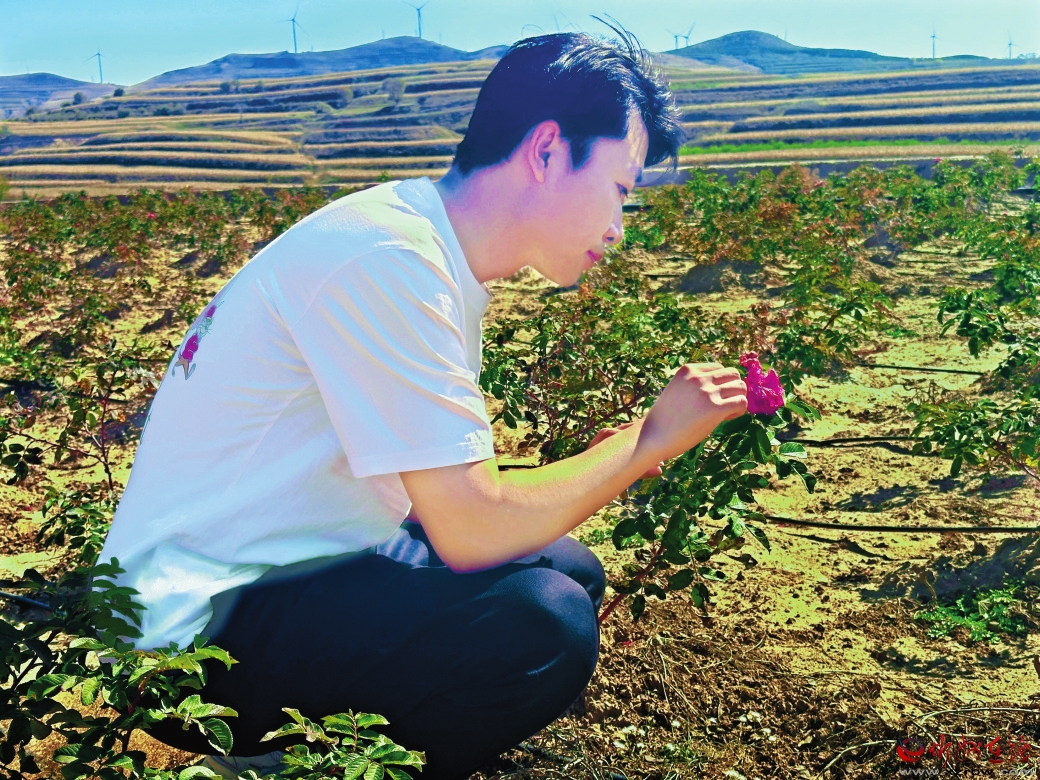 他了解到食用玫瑰有銷路但縣域內(nèi)沒有種植。在與村“兩委”商議后建議村民種植食用玫瑰。這個想法得到了鎮(zhèn)黨委的認可,先在圪坨莊村試種8畝、八角村試種2畝。試種初期出現(xiàn)了問題,田里每日需人工澆灌,看管困難。他又建議村“兩委”鋪設(shè)管道建立滴灌系統(tǒng)和安裝監(jiān)控來實現(xiàn)精準管理。他還與村“兩委”商議,利用光伏資金,設(shè)立工作崗位,從建設(shè)種植到開花期日常維護,用工量已達100余人次,村民的收入也隨著玫瑰花開而增加。玫瑰示范園的建成,為農(nóng)產(chǎn)品深加工、發(fā)展鄉(xiāng)村旅游和補鏈月餅產(chǎn)業(yè)奠定了基礎(chǔ)。