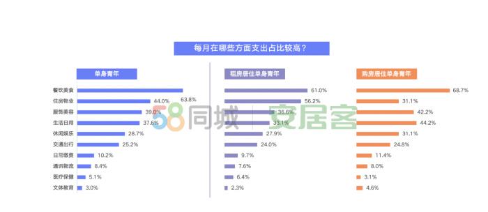 吃,是一大生活樂(lè)趣來(lái)源。報(bào)告顯示,63.8%的單身青年表示每月在餐飲美食上的花銷占比較高。此外,住房物業(yè)、服飾美容、生活日用等方面也是單身青年的主要開(kāi)銷。